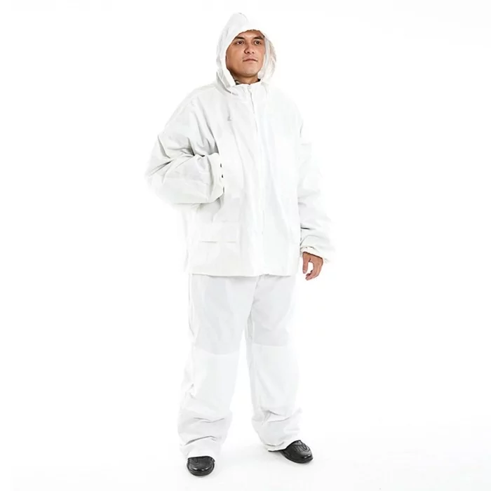 Костюм подходит для маскировки в зимнее время года. Цвет камуфляжа имитирует снег.ОсобенностиКостюм изготовлен из лёгкой, прочной, отбеленной саржи, которая свободно пропускает воздух и обладает дышащими свойствами.Ткань не шуршит и не блестит.Куртка застёгивается на молнию, имеет широкий капюшон с регулируемыми утяжками.Пояс брюк на резинке.Маскхалат имеет свободный покрой и надевается исключительно поверх зимней одежды.